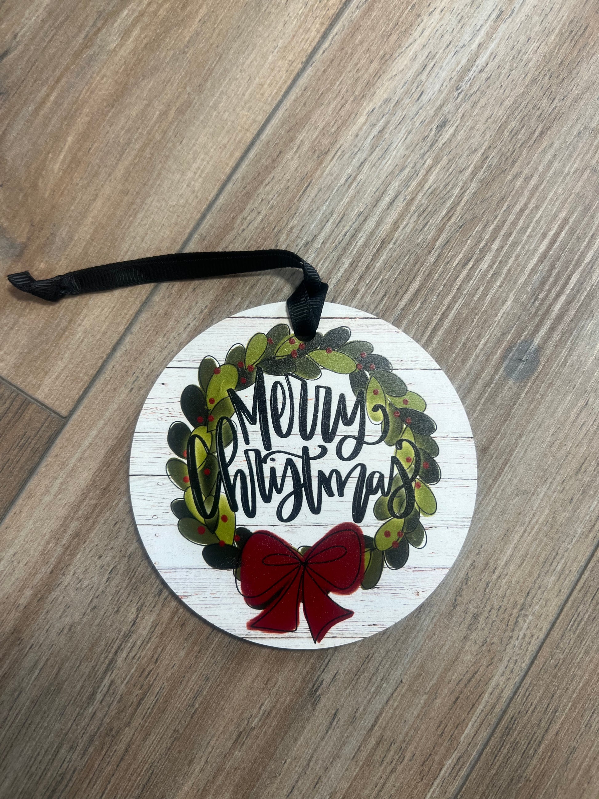 Merry Christmas round wooden ornament with black ribbon
