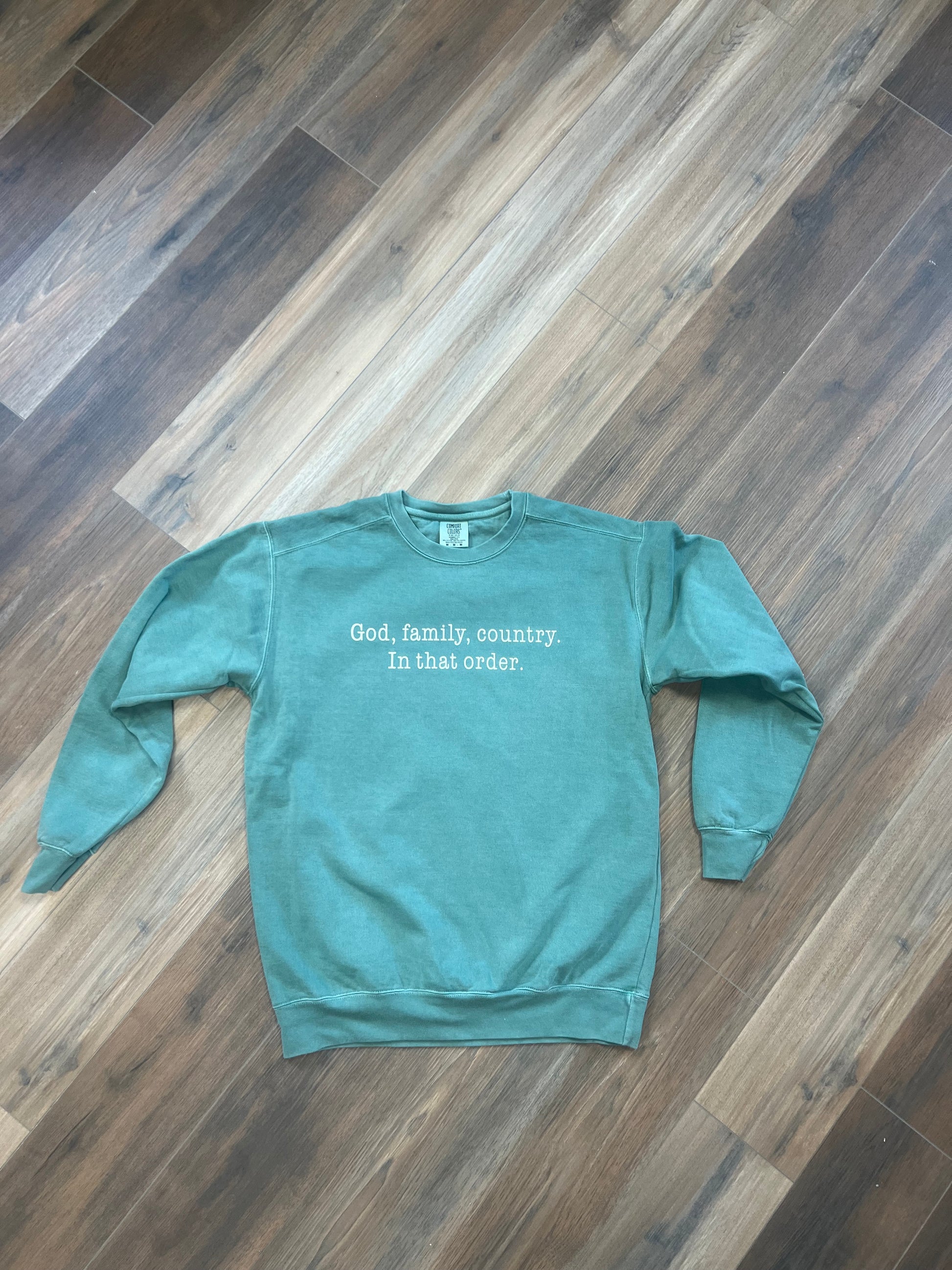 God, Family, Country. In that order print on comfort colors sweatshirt